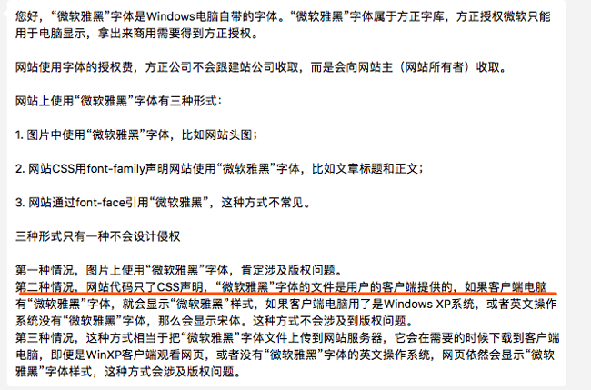 二、而關(guān)于字體侵權(quán),要特別注意,有朋友說使用微軟雅黑字體,不會侵權(quán);但是我們查詢了官方的說法,直接使用微軟雅黑也是侵權(quán)的,但是有一種情況不侵權(quán),網(wǎng)站代碼中使用CSS聲明,“微軟雅黑”字體的文件是用戶的客戶端提供的。