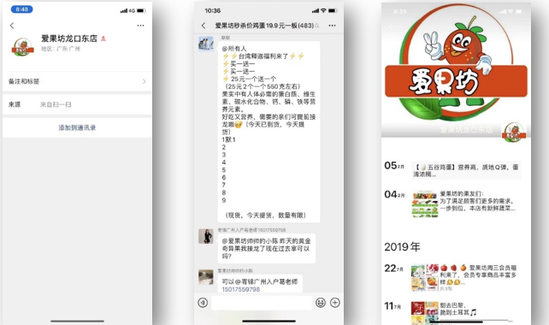 疫情期間,愛果坊一方面通過擴充品類,加入了更高頻剛需的蔬菜作為引流產品,另外一方面,愛果坊在每個門店配置了工作手機,由店長管理。本次疫情,愛果坊利用私域流量大力發展線上營銷,使用群營銷和朋友圈營銷,每天在微信群進行產品預告預售,接龍秒殺,完成門店的每天2.5萬+的銷售業績。