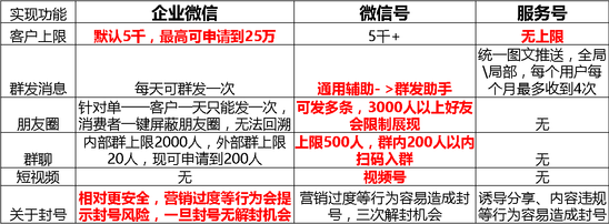 建群方面,企業微信可以建200人的群,微信號可以建500人的群。服務號無群。