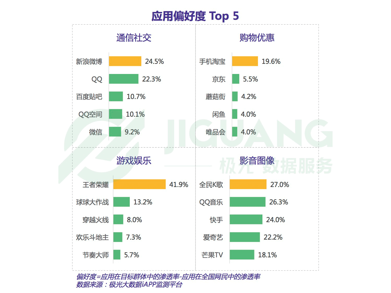 通過對應用偏好度進行分析,我們發現狼人殺用戶群體偏好度高的通信社交應用是新浪微博(24.5%),被譽為“國民級社交應用”的微信則以9.2%的偏好度排名第五。在購物優惠類別的偏好度上,手機淘寶一馬當先,達到了19.6%。