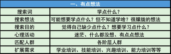 如上圖可以得出結論,當用戶在搜索學點什么的時候,用戶單純的只是想學點東西,但是并沒有明確的目標,不清楚自己的需求是什么,十日后推薦各位SEMer這時候要做到的是給用戶:制造需求。