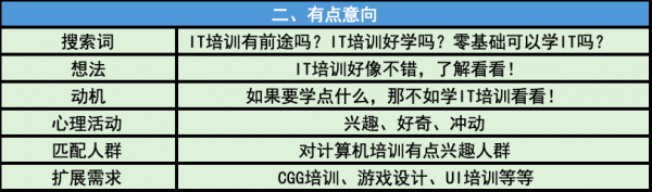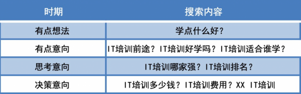 這個時候的網民大多已經有了需求,會有目標的區搜索,就覺得IT培訓好像還不錯啊,我要去搜索一下了解一下,這種時候各位SEMer需要考慮的是,用戶會怎么搜,十日后一般會拓展性的做一些詞,比如IT培訓出來好找工作嗎、IT培訓前景怎么樣、小白可以學懂IT嗎,這類詞會再一次加深用戶的需求。