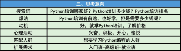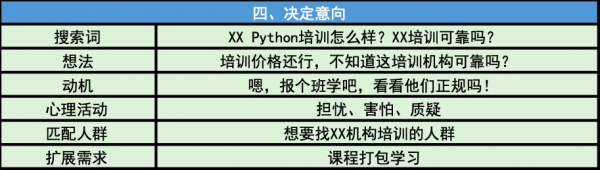 在搜索引擎搜索了非常多的IT類培訓,用戶最終選擇了Python做為學習目標,于是就開始在搜索引擎搜索Python相關的培訓機構哪里好,多少錢,這段時間是各位SEMer最需要幫網民鞏固需求的時候。