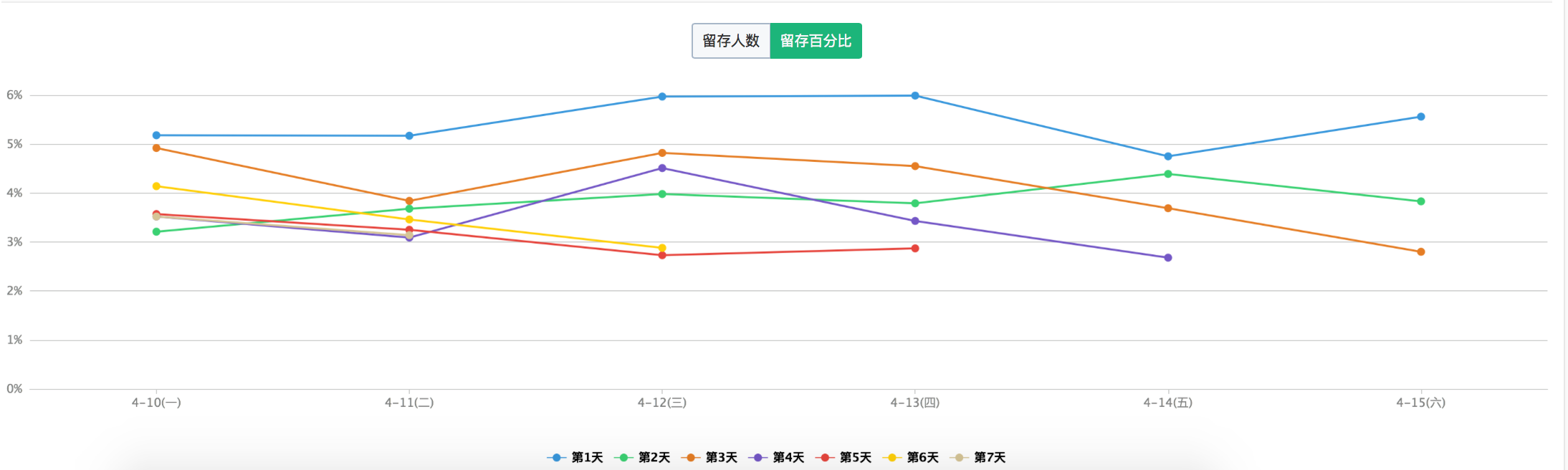 運營人員想從總體上看用戶留存的情況是否越來越好了??筛鶕掠脩魡?APP 的時間按日或按月進行分組,得到同期群,觀察該群體用戶發生投資的 7 日留存、14 日留存或 30 日留存(可自由選擇),通過比較不同的同期群,可以獲知。也可以點擊“曲線標識”按鈕,就可以看到每天留存率的變化趨勢了。