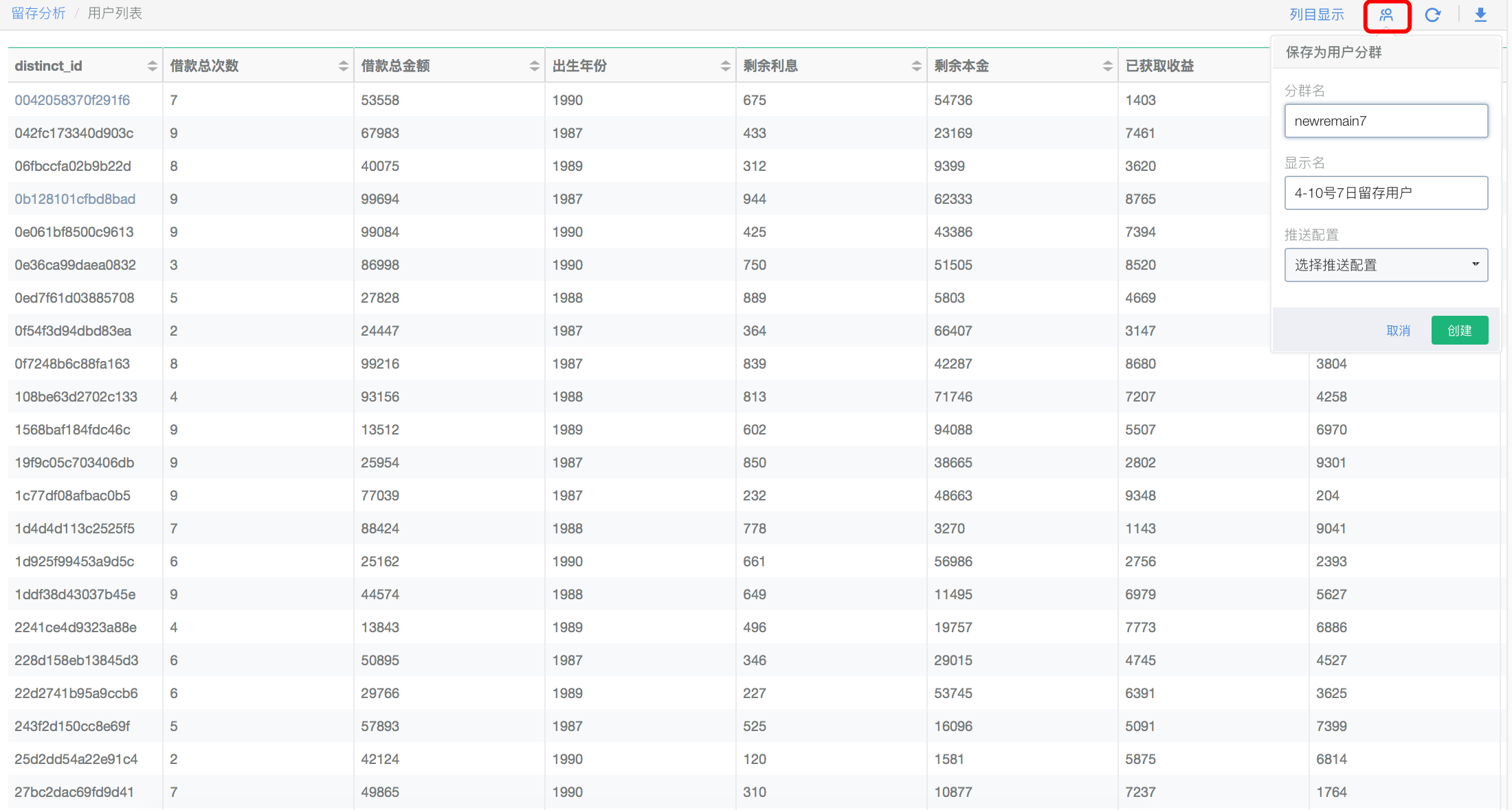 對于 7 日或者 30 日仍留下來做投資的用戶,顯然是一批忠誠度非常高的用戶,什么樣的用戶群體有這么高的留存率?以 4 月 10 號這天的新用戶為例,一共有 1931 個新用戶,在第 7 天有 68 人留下來了,點擊“ 68 ”這個數字,我們進入了用戶列表界面。