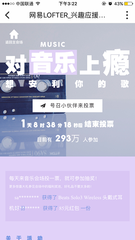 網易LOFTER舉辦了一場線上投票的活動,可以為心儀的音樂投票,甚至邀請朋友一起來投票,每天都有5次投票機會,用戶每天都會登錄這個頁面投票。