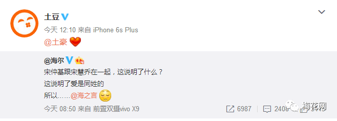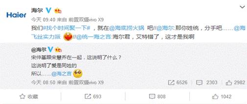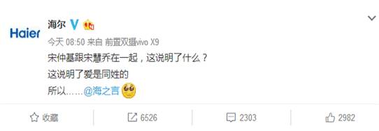 反應最快的要屬海爾了。海爾立馬get到了宋仲基和宋慧喬同姓的點,迅速發微博@和自己同姓的品牌,強行組CP。