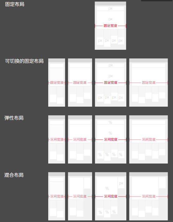 從以往的布局設計來看有這幾種類型分為四種類型:固定布局、可切換的固定布局、彈性布局、混合布局。