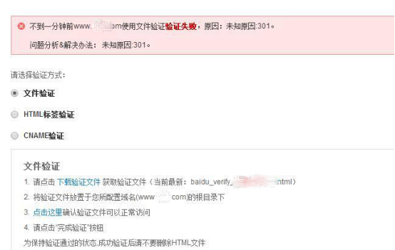 5、文件驗(yàn)證有時(shí)候也會(huì)出現(xiàn)驗(yàn)證失敗的情況。使用其它任意一種方式都可以,如果是301的問題可以臨時(shí)修改服務(wù)器的配置,或者使用其它任意一種驗(yàn)證方式。