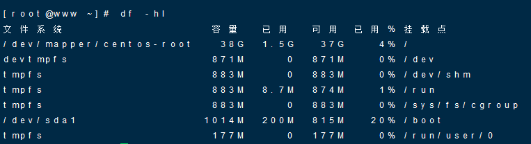 命令mount /dev/sdb1 /home,掛載/dev/sdb1分區到/home目錄,掛載成功后可用df -hl命令查看掛載的分區以及目錄,這里查看到成功掛載。