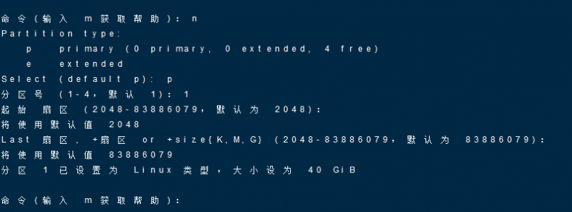 接下來我們輸入n創建一個新分區,后面選擇分區號和扇區有需要可以自行修改,這里我使用默認的。