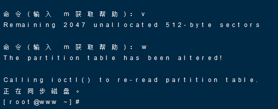 輸入v驗證分區表,再輸入w寫入分區表并且退出fdisk命令,到這里我們分區的步驟就完成了。