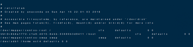 5.修改/etc/fstab文件,讓系統啟動時自動掛載上我們剛剛掛載的分區,否則重啟后分區需要重新掛載。