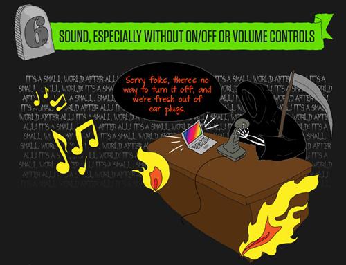很多網路使用者,例如:上班族、行動上網族、圖書館讀者,最怕突然聽到網頁終的音效從喇叭沖出來,因此不要設計音樂于網頁中,如果必要,請設計好靜音的功能給使用者。