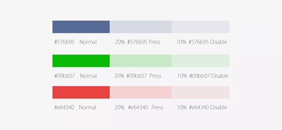 藍色為鏈接用色,綠色為完成字樣色,紅色為出錯用色 Press 與 Disable 狀態分別降低透明度為20%與10%。
