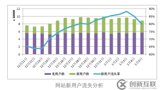 例如,網站的推廣部門有個需求:網站在年底的圣誕和元旦雙節日(12月24日到1月3日,為期11天)針對新用戶做了一個促銷推廣活動,活動期限內新注冊用戶可以免費領取20元的現金抵價券,在3天有效期內購買任意商品時都可以使用,需要分析這次活動為網站用戶數的增長所帶來的效果。從活動的內容來看,活動的主旨是帶動網站新用戶的注冊和消費,為網站積累用戶數,既然針對新用戶,可以對流失用戶做進一步細分,分析活動期間新用戶的流失情況,如圖所示。