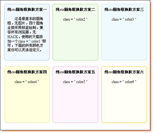好了,我們將上面的所有代碼集中起來,就完成一個純CSS圓角框的實例模型,在源碼中,我設置了六套顏色方案,其它的顏色方案就看你的了。