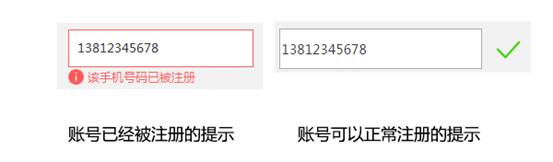 當用戶輸入手機號,光標離開“手機號碼”輸入框時,通常我們會立即給用戶反饋,這個手機號是否已經被注冊,示例如下: