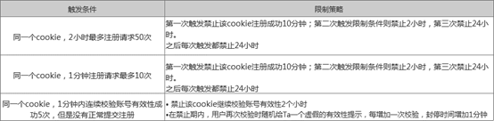 Cookie的風控觸發條件和限制策略與IP相同,但是閥值不同。