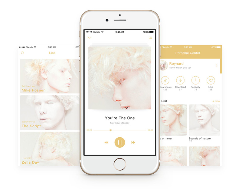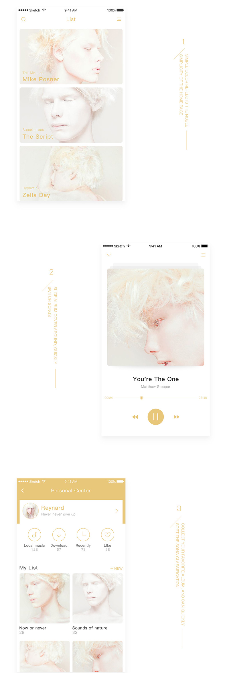 第二個音樂app界面顏色搭配,采用黃色,其中整體有種給人以雕像靈魂發出的樂聲。