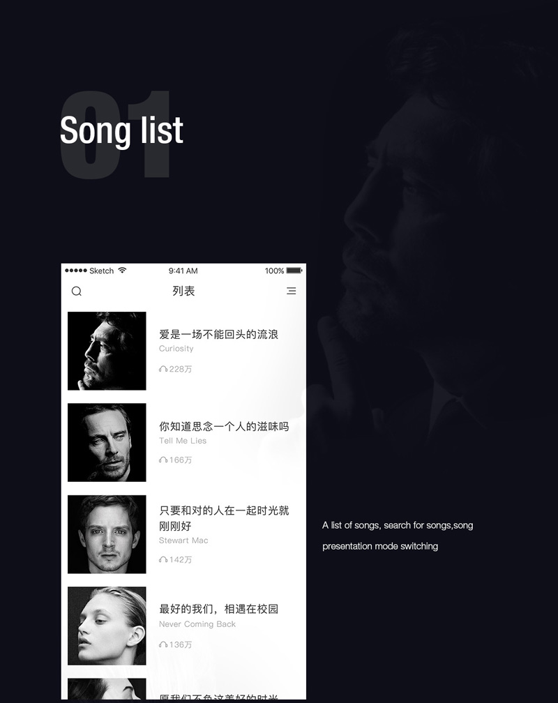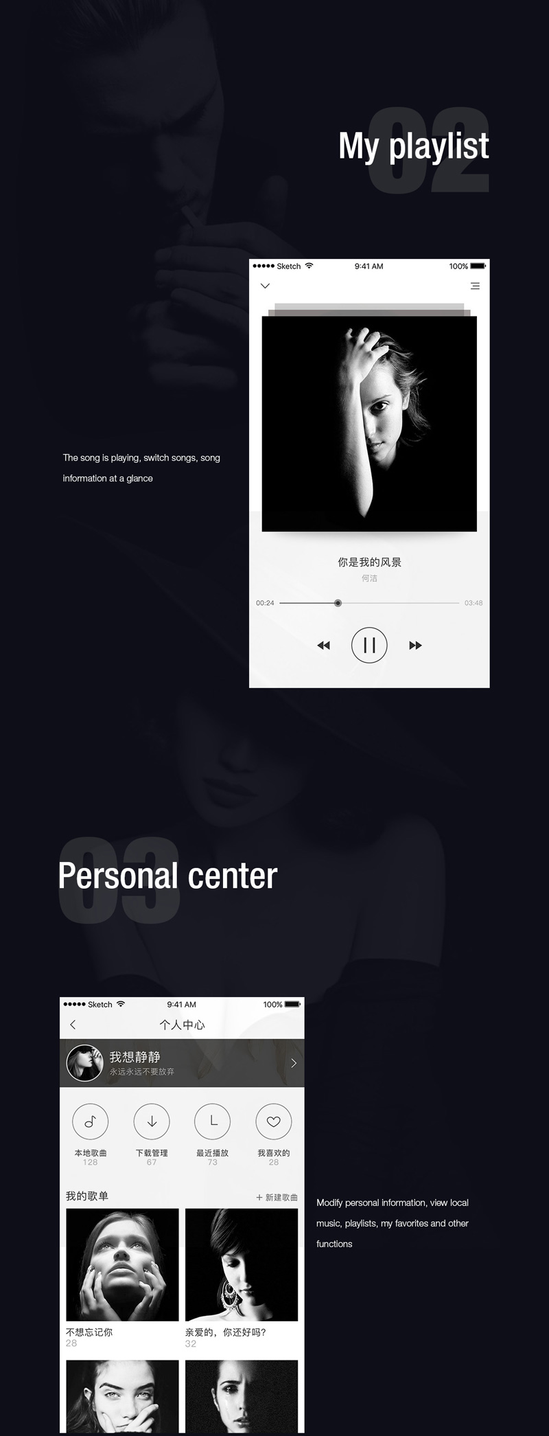 第四個音樂app設計界面顏色搭配,采用經典的黑白配,整體是簡約的黑白風格。