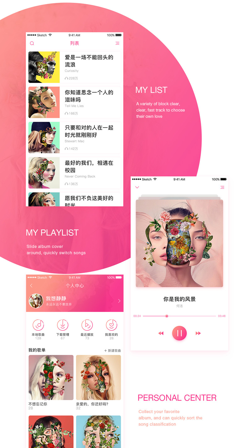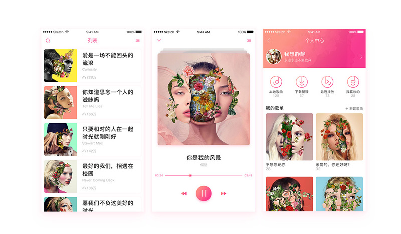 第五個音樂app界面設計顏色搭配,女生藝術氣息的音樂,采用粉紅色,有體現女生的天真爛漫。