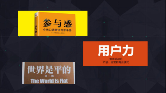 比如說這三本書的標題,《參與感》,大家知道參與這個詞是很熟悉的,但是加了一個“感”字,“參與感”就有點陌生了,讓人好奇。《世界是平的》,其實大家都知道世界是不平的,是個球形,這個標題也讓人好奇。《用戶力》也是同樣的道理。這三本書都是暢銷書,你們可以從他的書名里感覺出來,給你一種既熟悉又陌生的感覺。