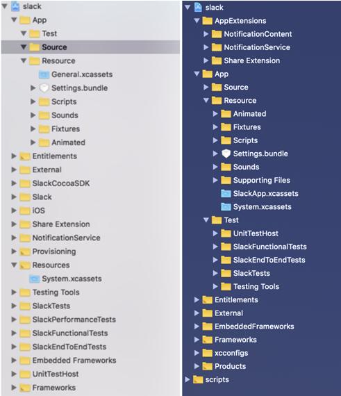 Slack iOS Xcode Hierarchy 2017(左) and 2018 (右)