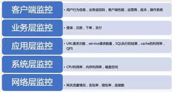 因為要對整個 IT 系統進行監控,所以將其分為五層,分別是,客戶端,業務層,應用層,系統層,網絡層。