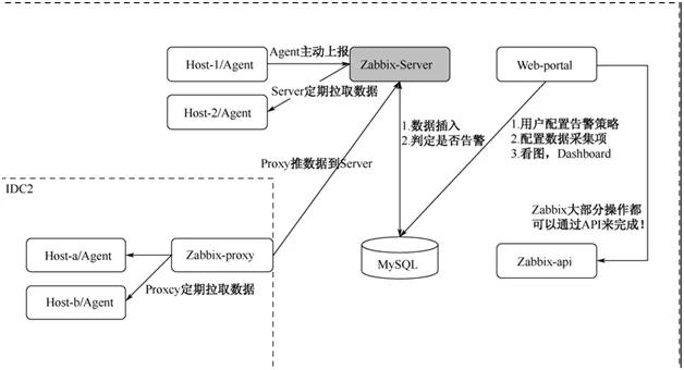 以 Server 拉取數據為例,用戶在 Web-portal 中,設置需要監控的機器,配置監控項,告警策略。Zabbix-Server 會根據策略主動獲取 Agent 的數據,然后存儲到 MySQL 中。