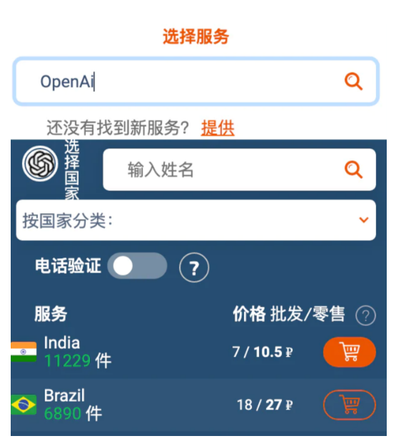 然后到我們的接碼網站上去。在左側搜索OpenAi,然后選擇巴西。