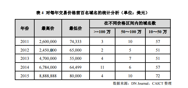 其一是優質資源的稀缺。據DN Journal綜合全球多個域名交易平臺而整理出的數據顯示,多年來高價域名的價格區間較為穩定,但從 2014 年起,高和最低成交價逐步提升,兩者的差距也愈加拉大。而在 2015 年高和最低成交價達五年來高,從不同價格區間內的域名數來看,10- 50 萬的域名數量接近90%,這反映出優質域名日漸稀缺,平均價格趨勢逐漸降低。如果再向后推數十年,很有可能會到達一個臨界點,屆時優質的和稍微有潛力的都被占盡,很難再挖掘出新的市場。