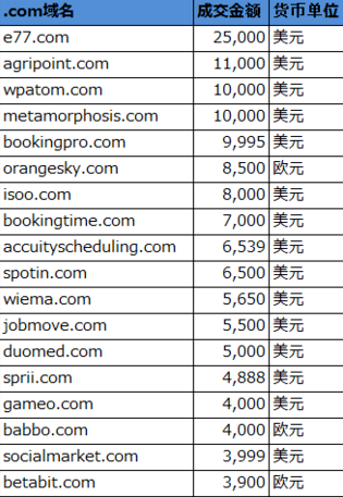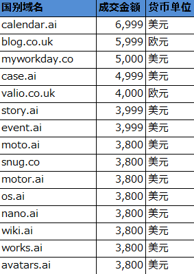 從 2017 年 1 月份第三周的sedo交易榜可以看出,在國別域名中.ai域名后綴已經占據了榜單的半壁江山,而且交易價格普遍高于其他地區,甚至排除超過10, 000 美元以上的.com相關域名,.ai和.com的價格相差已經較少。這足以說明.ai相關域名的價值正在逐漸被認可。