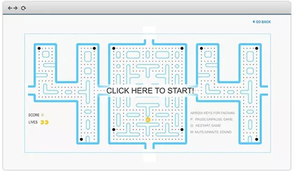 同樣的404頁被制作成小游戲。 該公司選擇了經典的街機游戲Pacman。