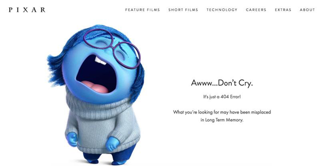 皮克斯的404頁面使用“特務團隊”中的“擔心”在屏幕上哭泣,并附有“Awww ... Do not Cry”字樣。