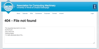 這是伊利諾伊州Champaign計算機協會網站的404頁面,其中一段文字將會一個接一個地寫,告訴你,它無法找到該頁面,甚至“爬到垃圾箱并 分解自己。“