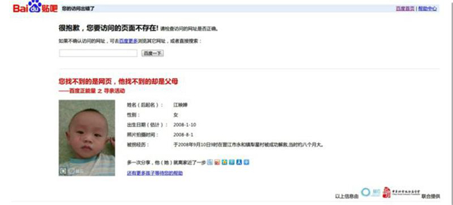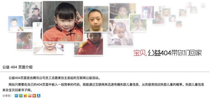 騰訊,百度和網易的“404頁”都缺少兒童信息。 這404頁面允許用戶在404頁面中嵌入一個簡單的代碼。 通過此頁面顯示失蹤兒童的信息,反映公司對公益的態度。。