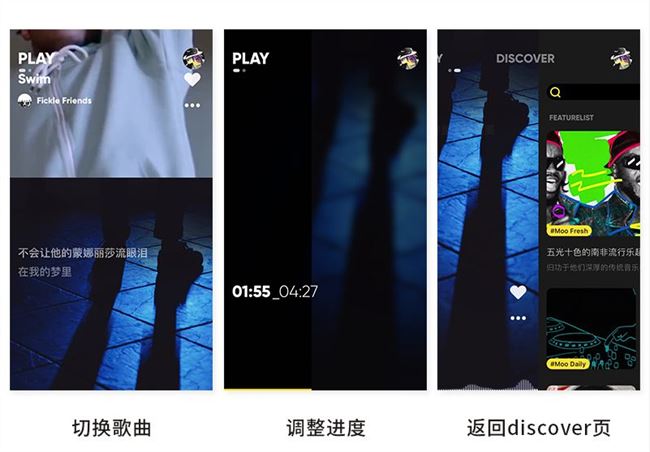 去除這個虛擬的“唱片”給我們帶來不僅僅是視覺上的輕量感,更意味著易用性上提升。用戶在moo音樂中切換歌曲、調(diào)整播放進度、返回上一級頁面等都可以通過滑動手勢來完成。并且它是幾款音樂產(chǎn)品中,唯一一個支持上下滑動切換歌曲的,網(wǎng)易云音樂是左右滑動切換歌曲,而qq音樂直接不支持,用戶必須點擊才能切換歌曲。我在之前的文章用戶體驗之點擊和滑動也提到過,滑動手勢比點擊更容易受到用戶的青睞。