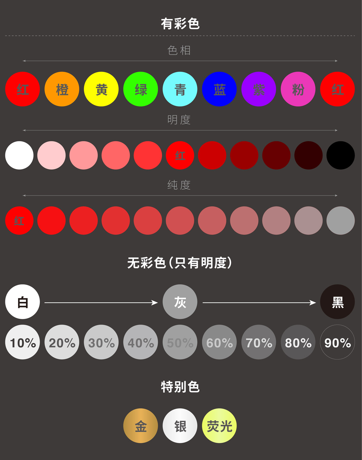 2、無彩色:黑色、白色、灰色稱為無彩色系,它們沒有色相和純度,只有明度。從最亮的白色開始,依次為白、亮灰、淺灰、亮中灰、中灰、灰、暗灰、黑灰、黑等,共11個層級。