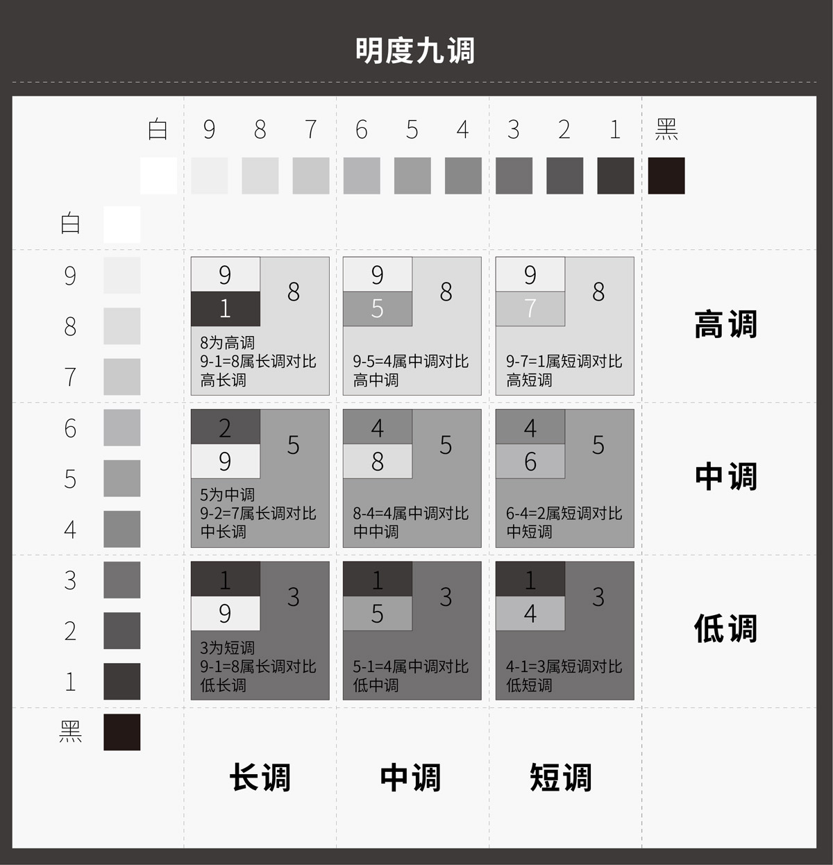 由此我們可以得到明度九調:低短調、低中調、低長調、中短調、中中調、中長調、高短調、高中調、高長調。