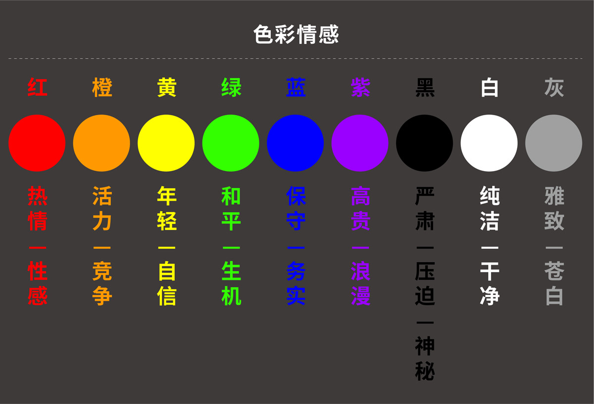 在色彩的情感表現中,色相決定了情感的基調,明度確定強度,純度確定態度。純度越高,態度越積極,純度越低,態度越消極。