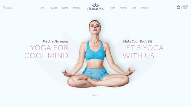 另一個很好的體育網站的例子是YYoga。本網站設計具有舒緩和鎮靜作用。主要使用的顏色是淺綠色和白色,作為背景使用。