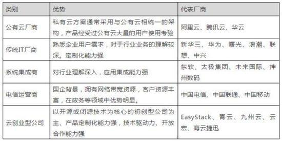 相對來看,私有云市場格局更為分散,行業中不僅擁有傳統IT廠商為代表的華為、新華三、浪潮,創業型的青云、九州云,還有系統集成商類的東軟、神州數碼等多個陣營。