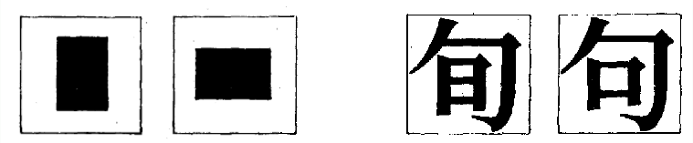 上圖上1為正方形,2是1旋轉45度后形成的菱形,但是在視覺上看起來卻比1更大。3是與1等高的菱形,它的面積變小了。4與1相同,5是大小感覺上與4相等的菱形,但實際上5比4小一點。下一排的漢字也是依照這樣的理論得到的。我們在設計時應注意字體外形的差異帶來的錯覺,追求整體視覺的統一而非物理統一。