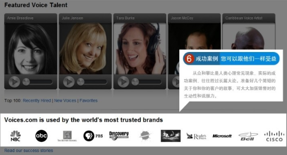 在這個案例中,網站通過展示他們服務過的知名客戶標志來展示他們的成功案例。當用戶看到NBC、ABC、 DISCOVERY、 Micro sof這些非常熟悉的著名公司的標志時,對網站產生了更多的信任感。這些知名公司類似于明星效應,大大提升了網站的說服力。