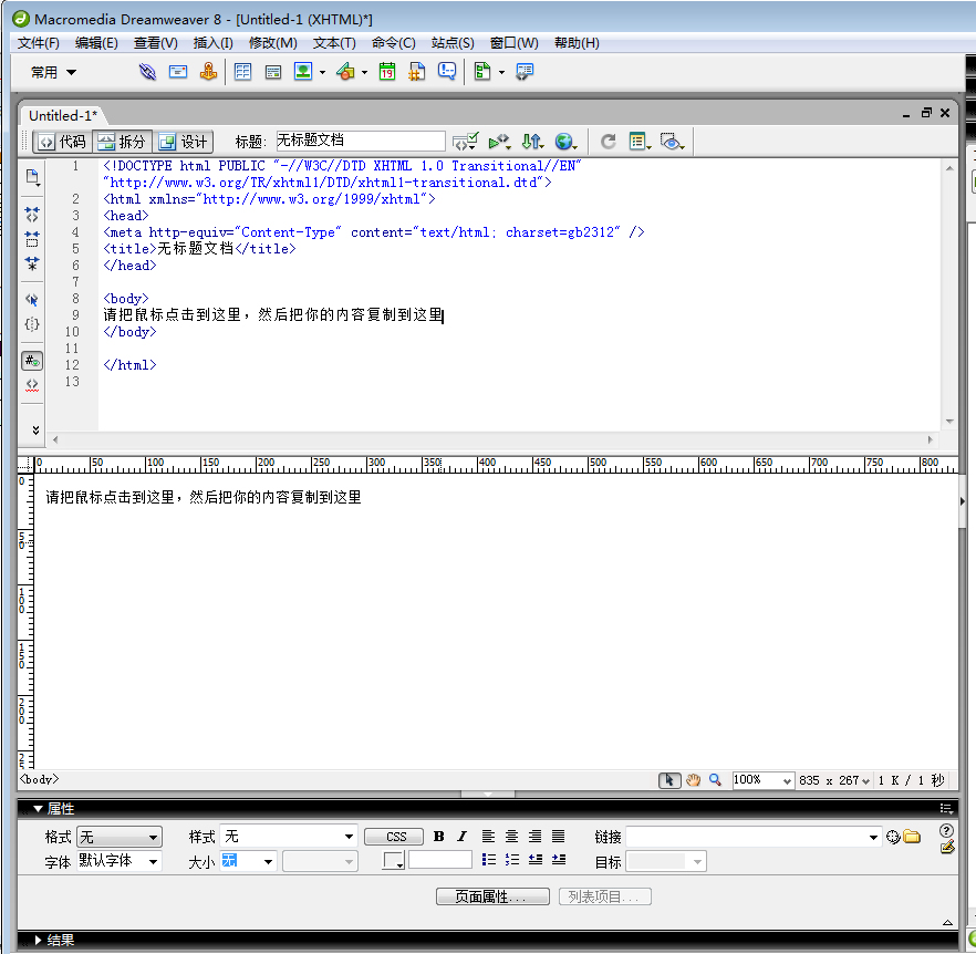 (3)編輯區分代碼、拆分、設計三個部分,一般點擊到拆成狀態就可以,這樣的話可以同時看到排版效果和代碼兩種(下面是設計區,上面看到有默認代碼的部分是代碼區),把你的鼠標點擊一下下面的設計區,然后把內容復制到這一塊。