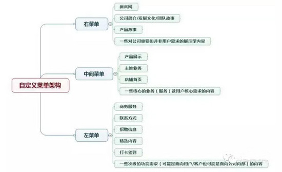 對于微信公眾號內容的構建,首當其沖的就不得不說自定義菜單了。自定義菜單到底有多重要呢?你家的山門和服務以及用戶的需求都將在這里接頭,你說不重要么!以下是個人對微信菜單的架構的分析圖:
