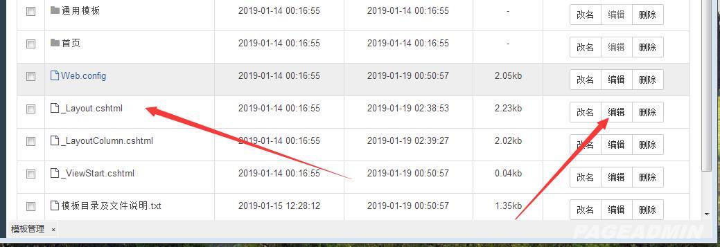 3、選擇_Lauout.cshtml這個母版文件(也可以在底部模板文件文件中填寫,只要加到網(wǎng)站底部頁面就可以),點擊編輯。