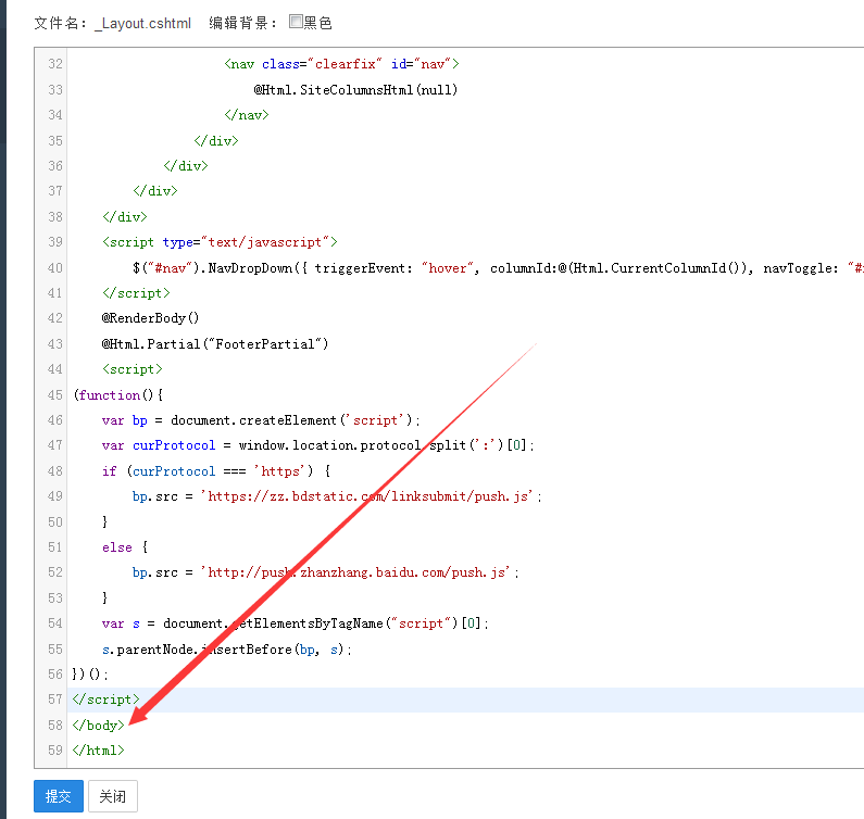 4、點擊編輯,彈出代碼編輯窗口,把百度提交代碼粘貼到</body>標(biāo)簽前面即可: